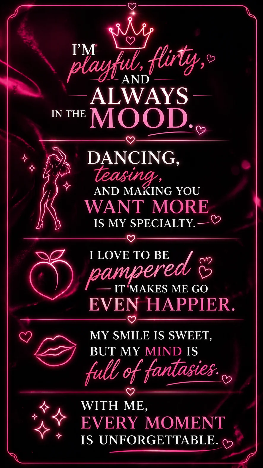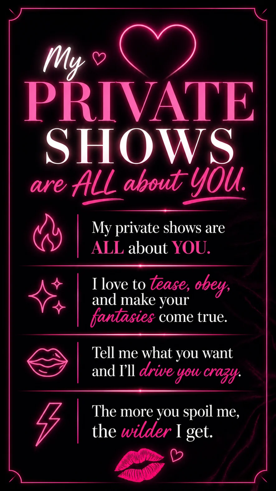 🔥 My private shows are ALL about YOU. ✨ I love to tease, obey, and make your fantasies come true. 💋 Tell me what you want and I’ll drive you crazy. ⚡ The more you spoil me, the wilder I get.
